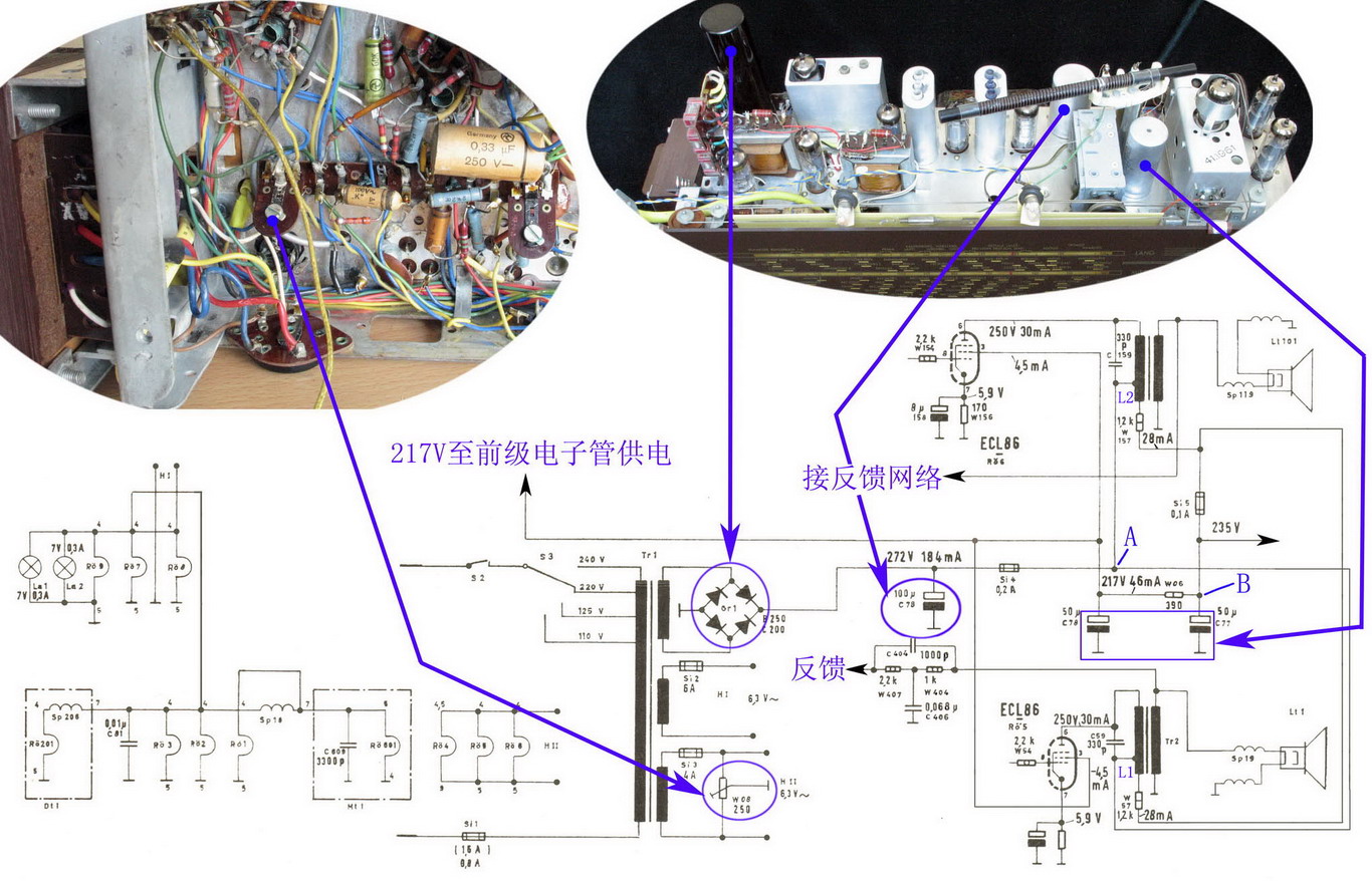 1.整机电源供电系统见图06。利用电源整流输出的电流方向与电子管ECL86中五极管(第6脚)屏流相反的特性,左、右声道的输出变压器初级绕组的一部分,兼具前级电子管乙电滤波电感功能,这两个输出变压器中的乙电扼流线圈是并联着同电解电容形成π形滤波功能的(图中滤波线圈L1、L2并联接于A、B点之间),一定程度上提高了滤波效果。在甲电供电上,电源变压器6.3V输出线端接了一个抽头接地的250Ω电位器(见图06),有效的降低了交流声电平。