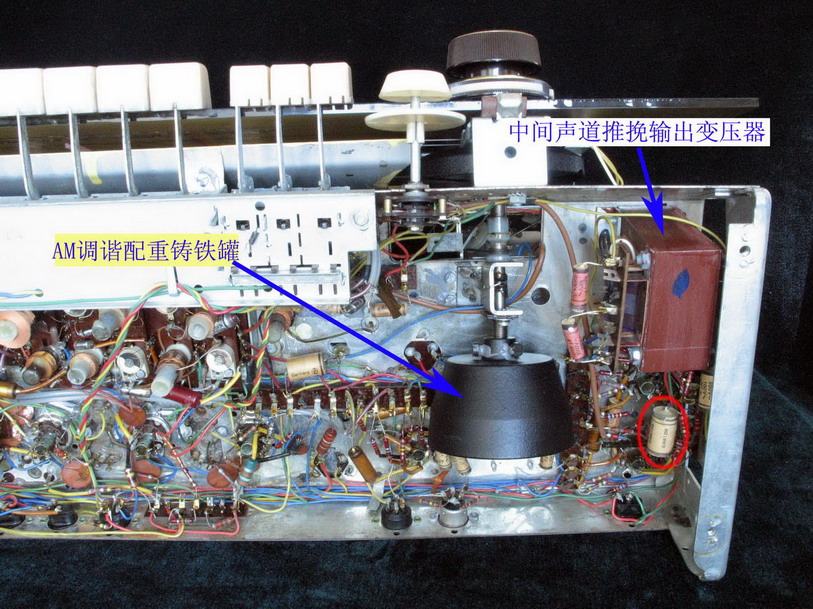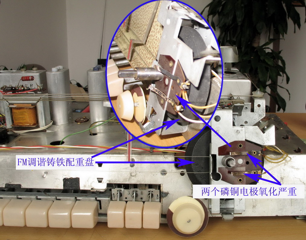 机器通电了,中、短波能收到若干电台信号,接收音质可以。但在调频波段,旋转FM调谐旋钮,满频率刻度盘只能收到一个信号,几乎占频率刻度盘的二分之一都是这个台的信号,声音不实,确定这是感应到的电台强信号。由于中波接收正常,那么自ECH81电子管之后的电路应该没有问题,重点检查FM高频头。