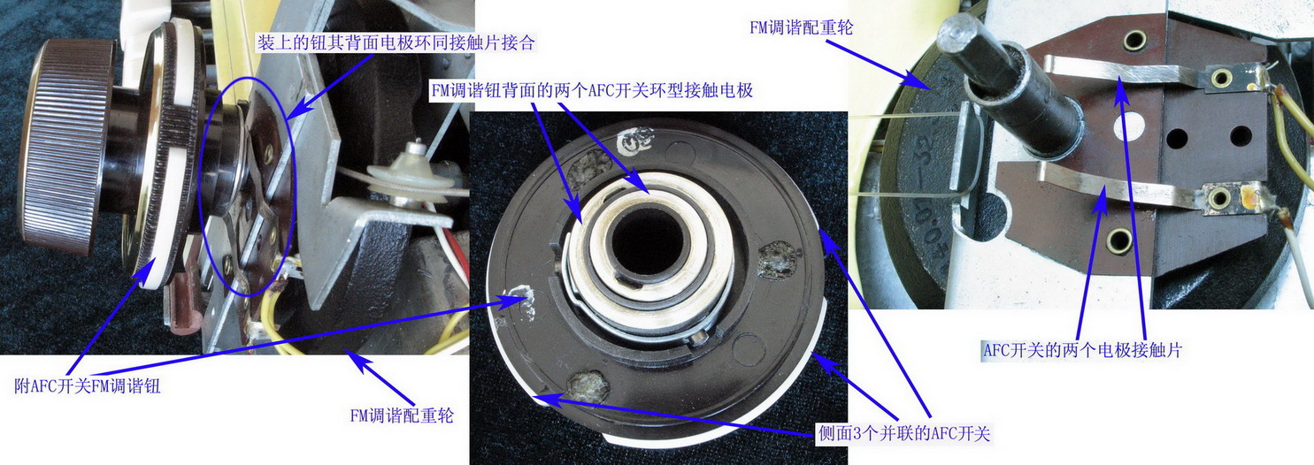 3.FM设置有独特的FAC控制机构,参见图20。FM波段的AFC功能开关安置在了FM的调谐旋扭上的侧面,三个白色弧状并联的开关按键等分FM调谐旋钮外周,当手指捏住FM调谐钮旋转时,必有两个白色AFC开关按键被压下,此时AFC功能关闭,参考频率度盘标示及猫眼闭合程度,调准电台后,松手,旋钮侧面白色AFC开关释放,AFC功能开启,收听中自动的校正FM振荡回路的失谐。
