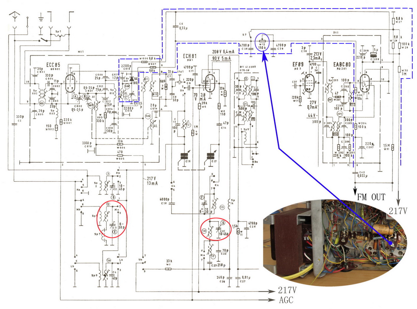 事先在FM接近度盘中间接收一个电台信号,不动旋钮,分别选用二极管为:2AK18、2AP10J、2AP9J、2AP9J,装上试机,往复五次,最终确定倒数第二只2AP9J管合适,上述误差最小。将换装2AP9J后的FM高频头安到机架上,这时,接收电台信号的指针示位,在频率度盘正确刻度右侧超过4mm(比起之前的10mm显然已经好多了),在图30蓝色虚线框里的AFC电路中,依靠调整分压电阻W29(原为100K)来纠正这一4mm宽的误差。实际上是重新设定施加的反向电压,使2AP9J的初始结电容符合原FM振荡回路的设计要求。这样处理后,频率刻度准确了,AFC的牵引范围的左右对称性也明显转好,但左边的牵引范围仍大于右边约4mm宽 。