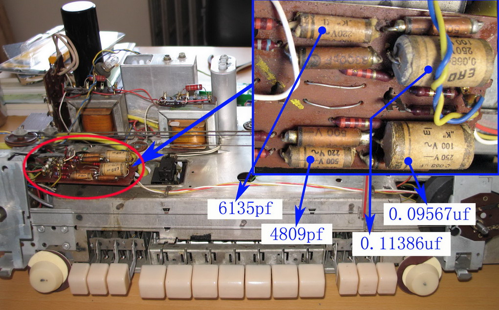 机器的左、右声道ECL86单端功率放大与中间声的ECL86 X2推挽功率放大电路中,都接有大环路负反馈网络——单T桥型带阻滤波器。单T桥型带阻滤波器对元器件参数要求较高,阻容选择精确合适时将具有很好的选频特性,但如果元器件参数偏离最佳值,或是电路调整不当时,指标性能下降很大。检修中发现左右声道两个相同的单T桥型带阻滤波器中,0.068uF的电容变值很大(电路参见图06),在焊开一腿测量时,一个变大为0.09567uF,另一个变为0.11386uF,见图70。这两个电容容值偏离原设计值太远,按公式计算两个单T桥型滤波器的阻带的中间频率已经变化了,而且左右声道变化不一致,更换这两只电容。同理,中间声道的单T桥型带阻滤波器中0.068uF电容经测量,也变大为0.09361uF,一并更换,见图03中红圈内的电容。再看图70,红圈内的印刷线路板上的阻容器件分别是:左右声道的两个单T桥型带阻滤波器和两个音量电位器的等响度高低音调补偿网络,其中左右声道的低频补偿电容4700pf也同样变值了,一同更换为原设计值的CBB电容。