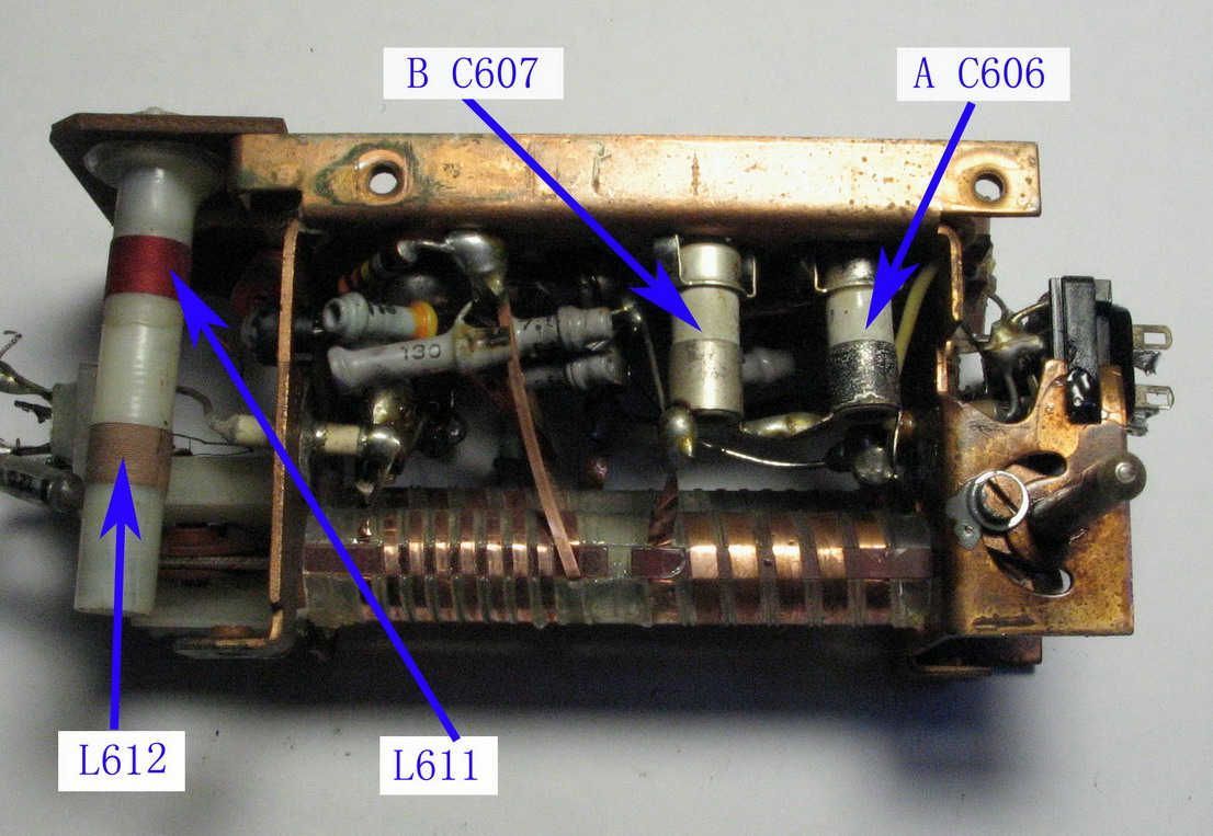 ⑵在调谐拉线的作用下,两个铝芯是反方向在各自的线圈管内运动着的,线圈L607与L605在调谐时电感的变化是同向的,而L609则与他们变化相反,抗磁性铝芯进入线圈管是起到短路线匝的作用,铝芯插入越深线圈电感越小。对照电路图可以看出联动调感的原理。