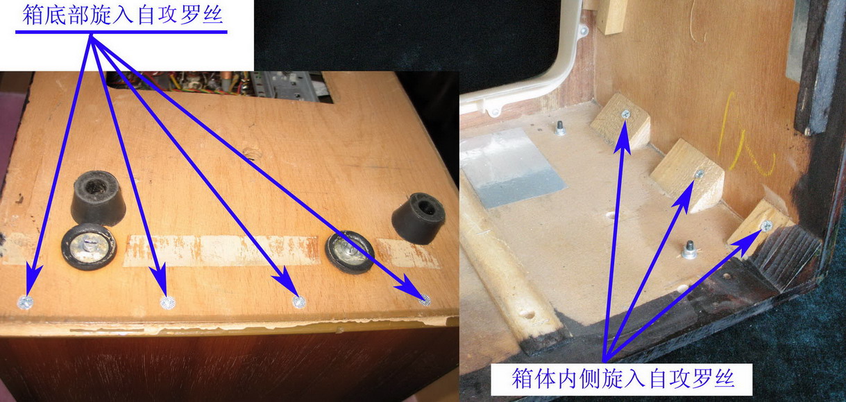 机器到我府后发现,机器木壳的底板同两侧立板接缝脱开,这是洲际运输带来的结果,庆幸没有造成其它部件的损坏。见图60,用早先的专门粘接木头的鱼皮胶(猪皮胶也可以,它要远远超过现在白色乳胶的粘结强度),将开缝的部位涂胶、对接、粘牢,同时机内、外钻若干小直径的孔,旋入自攻螺丝,见图61。顺带着装了四个橡胶机脚,原机木条机脚已是再寻它不着,待有时间再用木条做机脚。修好后的机箱稳固结实了,重放的音质也扎实多了,音量适当旋大,声音底气十足。