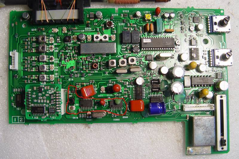 机子这现象在我经手几十台这款SW77机子从未遇到过,俺还有个怪脾气,越是整不明白滴事情越要去整整明白。看来与这台机子也如此较劲上了。分析既然打码主震频率会走是否是如以往经验电路板因电容漏液腐蚀后绝缘下降,MCU向PLL芯片写入数据时相关传送线间电平间相串而出错引起,将IC501、IC502 PLL芯片拆卸下,将底板MCU与这芯片传输部分作清洗后芯片再焊回,情况依旧。