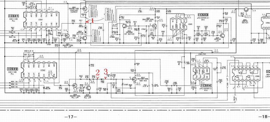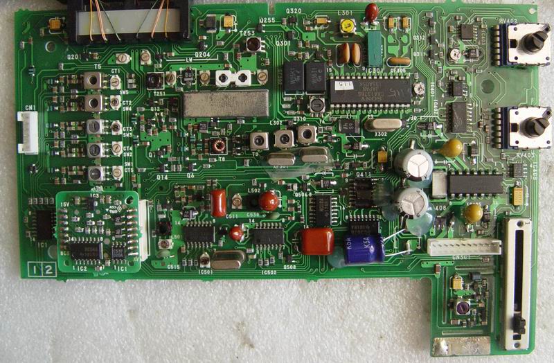 再仔细分析电路(有电路图维修不止方便90%),AM第一中频主震随由IC501锁相芯片推动,但其回馈输入是由IC502 锁相芯片经 IC503双混频器处理后取之。原来只查看了主PLL锁相输出,对也很关键的付锁相频率输出未给查看。会不会是付PLL锁相电路问题呢?频率计探针搭上,开机,哦!问题应该是出在PLL付震PLL这里。开机这端先一路向上走动不稳定。再结合主PLL电路在FM状态时完好(接收FM付PLL锁相不工作),开FM状态测图一(1)点电压即到位。觉得99%故障原因是付震PLL这里。啥原因呢?老化电解滤波引起?即动手将接收板上还未更换过的10来枚电解全剪除,清洗,焊上固但。开机情况依旧!