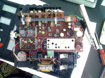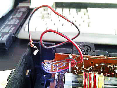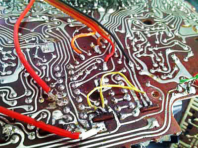 4、 FM频道开关处也多了2根导线连接,估计是焊接次数多了把印刷线路板烫坏后的补救措施。