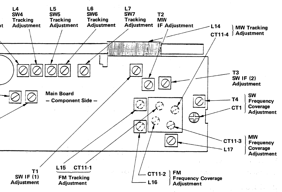 主要的布局大同小异,主要区别是4900的中波有个微调没有做在5连的密封连上,另外设立。4900的调频两个中周不用磁帽式,而用了磁罐和磁螺杆(对应维修示意图中L15,CT11-1两个)。槽口非常小,1.2 mm乘以0.65 mm的,可以用CD-1尼龙调整改锥。密封连上的微调CT11-2阻力不小,可用2 mm乘以 0.4的陶瓷或非感金属调整改锥(DA-30套装中的1#改锥)。一般爱好者当然也可以用身边其他无感材料来DIY这些小工具,但必须把最合适尺寸用在最合适的槽口,防止磁性材料崩裂。