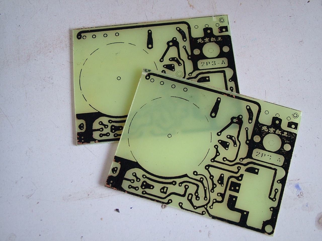 把画好的印刷板图反转180度后打印到热转印纸上,然后用热转印机印到敷铜板上(据说没有转印机用电熨斗也成),撕去转印纸,把敷铜板放三氯化铁液中腐蚀.