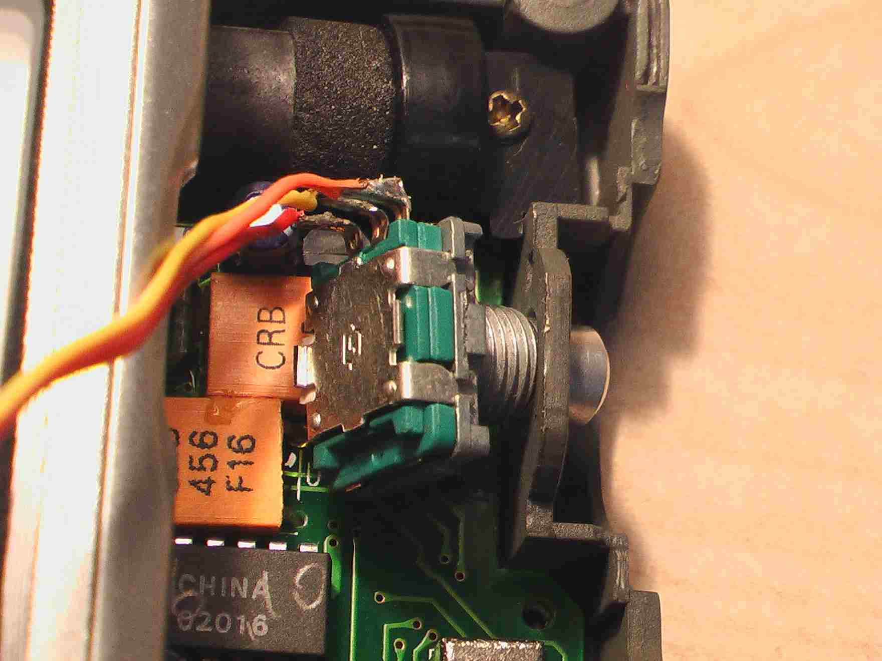 二、打开后盖,露出飞梭的安装位置。记住:引线一侧是向上的。