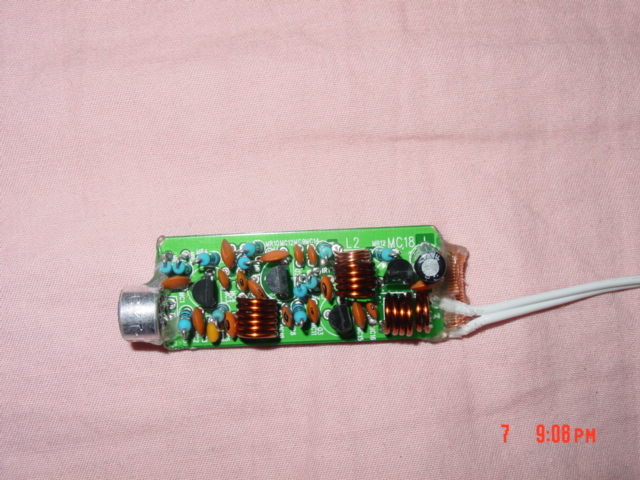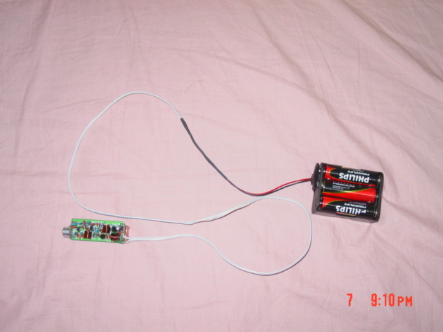 戴上6节五号电池工作了,电池连接线就是发射天线:经初步把玩后确认有效作用距离至少有200米(不拉收音机的天线)以上,呵呵