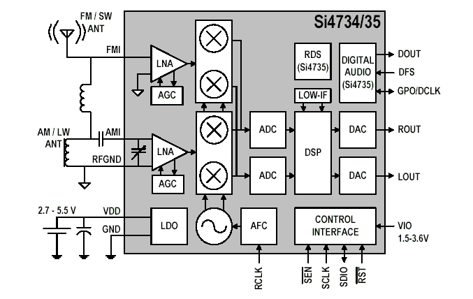 谈到DSP收音机,我们不得不提到其核心技术的掌握者 Silicon Labs最近开发成功的Si473x, Si473x是首款高度集成的调幅/调频收音机芯片,它将从接收输入信号到输出音频信号的所有功能全部集成至单颗芯片。传统调幅/调频收音机设计由于体积大、成本高以及生产困难,使得许多高产量的小型便携式应用无法提供调幅收音机功能。Si473x芯片只需两颗外部元器件和0.15平方厘米的电路板空间,远少于需要50多颗元器件和10平方厘米面积的传统解决方案。 得益于先进的数字架构,Si473x大幅简化设计与生产工作,它是唯一不需要人工调校的调幅/调频收音机芯片,这能为每个产品省下数分钟的校准时间。传统的调幅/调频解决方案可能需要4个阶段的手动调校,Si473x则能通过芯片内置变容器与自动校准功能支持各种天线,使得流水线的生产效率大幅提高。