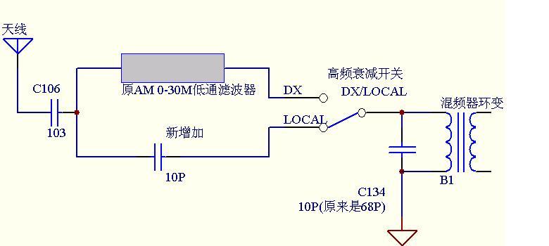 4、去掉R105(330欧)、R106(68欧);原天线信号衰减网络,拆掉不用了,准备借用S1开关;