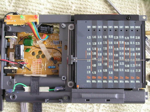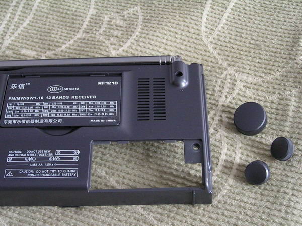 今天闲来无事,看着我那刻度不准的RF1210收音机就来气,所以动一下手术,将刻度位置调整一下,原来频率在短波电台位置要差近50千赫,主要在频率高端相差很多,因为指针有些斜,所以把它端正过来,先动手打开后盖上5个螺丝,一长四短,打开,可以看见里面电路板,工艺感觉还可以,后背板上有一个防静电及防干扰的铝箔,只能看到一个小集成电路,型号看不清楚,在卸下固定电路板的6个螺丝,翻过来就可以看到刻度盘了,这个机器用的喇叭是防磁的,感觉质量还不错,可惜没有标明功率大小,由于主要任务是调整指针,所以就不继续拆了,用手将指针掰正位置,然后将机身还原,调节接收17845千赫的NHK台,999千赫的中国之声,位置基本正确,胜利完工。