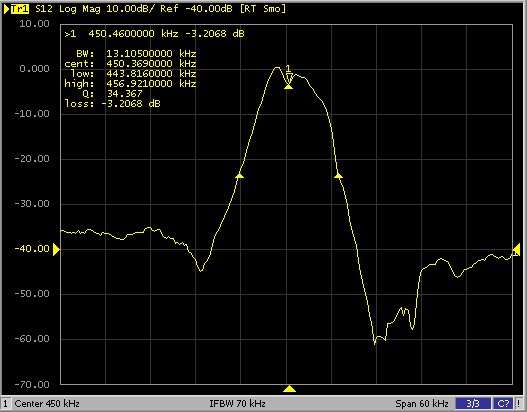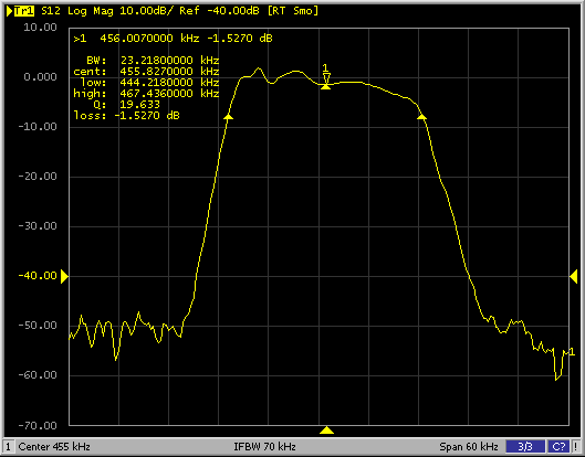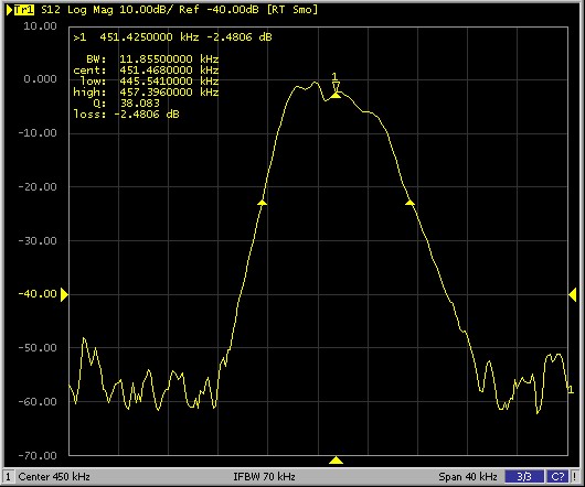 乖乖!好方正啊!第一次看到矩形系数这么好的虑波器。当然带宽不算窄,-6dB是23kHz。不过回头想想用在什么地方就明白了----VHF电台里面的。呵呵,同学们检到了千万别看到漂亮就换到收音机里面,那样好像不会有什么好处的。