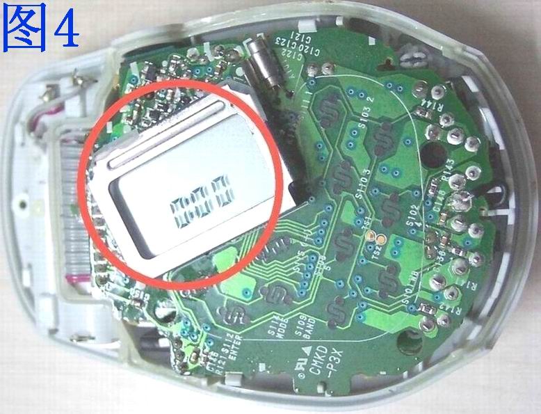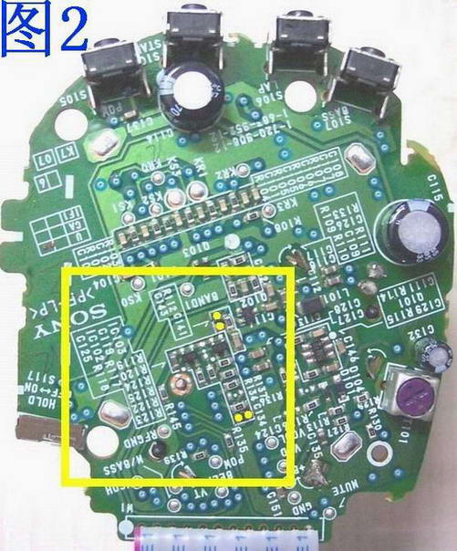 一、 拆开机身后背的所有螺丝,卸下腰夹和音量调节拨盘。小心揭开前面盖。先把连接操作控制板和接收主板的黑色导线(地线)焊开,否则是无法打开电路板改造的。位置在图1操作控制板正面的黄色椭圆内。