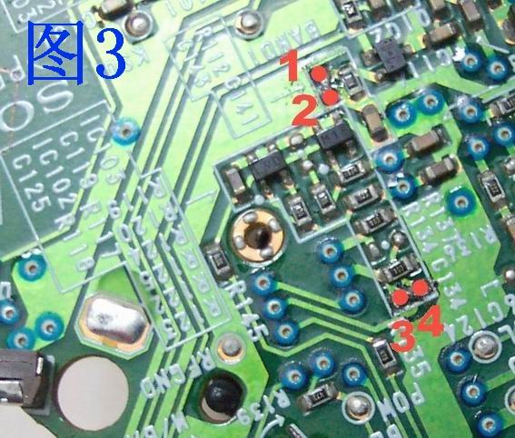 三、 mr7再把该区域电路放大,如图3。把电路板中的C143短路焊接起来(即把1、2两个红点所标的空白点焊接在一起)。同时,把把电路板中的R123短路焊接起来(即把3、4两个红点所标的空白点焊接在一起)。