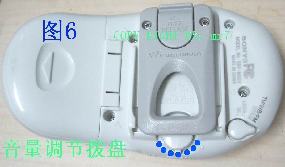 五、 随便把音量调节拨盘裁了一圈,免得由于身体摩擦经常造成音量过大或过小(说真的,SRF-M80V这一点让我最讨厌!)。具体可以先用刻刀顺着音量调节拨盘的内圈划线刻一圈线槽,然后用斜嘴钳把图6蓝色虚线部分剪掉。大功告成!