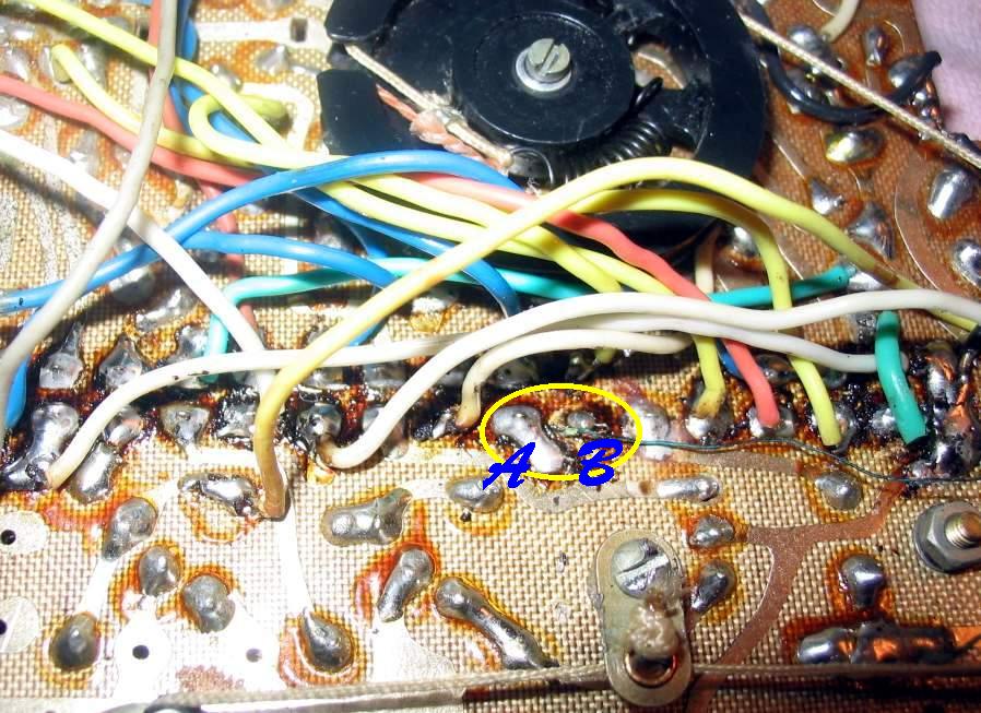 短路的接点是黄色圈内的A、B两点间,因为波段开关的重复装拆,B点焊盘已经脱落!短波一的天线耦合只能直接焊在波段开关引脚上了!