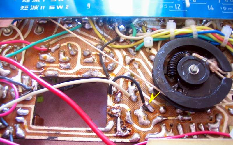 打开B-802-1收音机后盖,卸下电路板,寻找到1中放位置,可以看到其接入电平表的地方通过一根黑色的导线连接到“地”,省去了电平表。