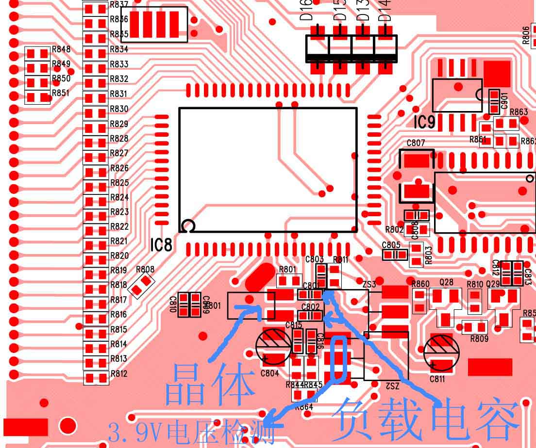 取一120p瓷片电容,一脚焊在晶振与C802共接的一端,另一脚焊在原7039A接地点,相当于与C802并联,改造完毕。
