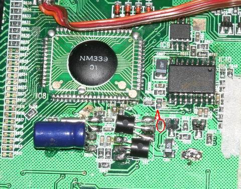 焊下从屏蔽板孔中可以看到的那个电阻,小心焊下留着,有用,并短接;焊下屏蔽板,焊下电阻A,换上刚才焊下的那个电阻,做这两步目的就是加大灯的电压和电流,使灯更亮。