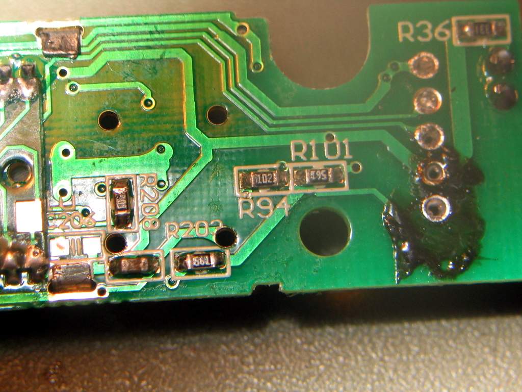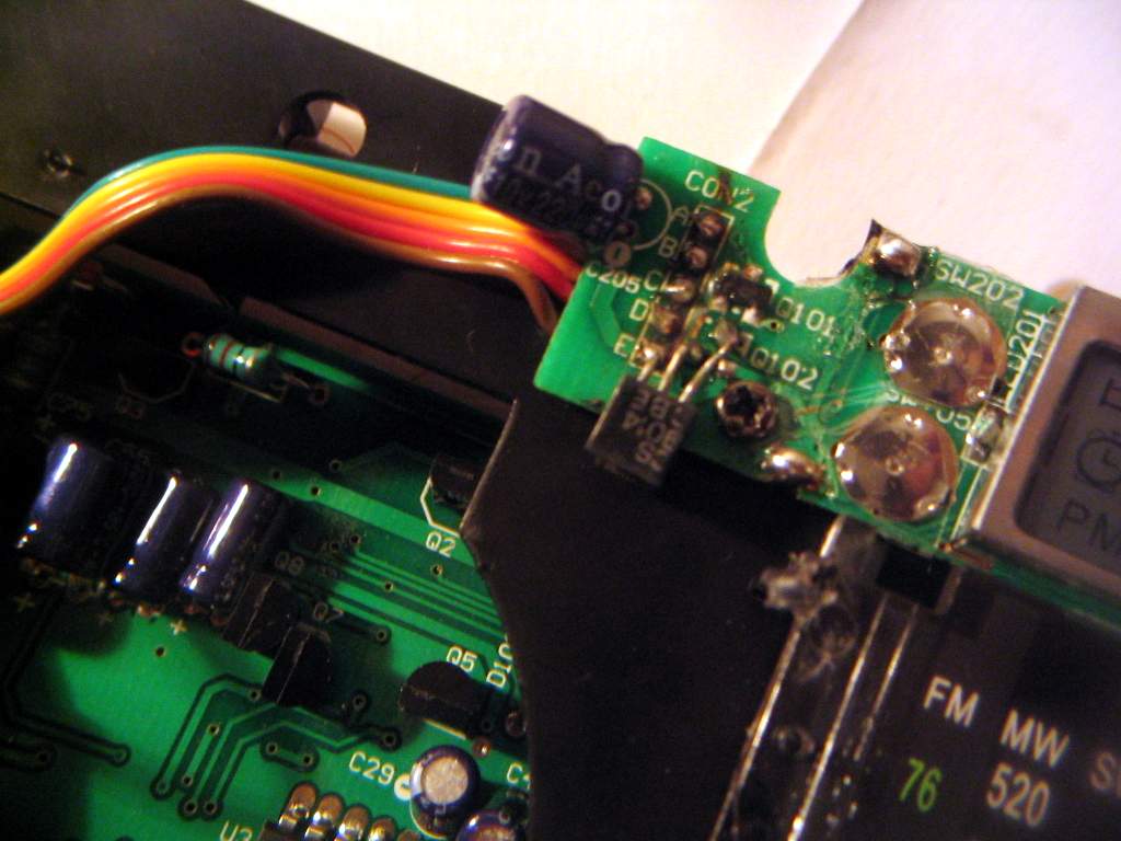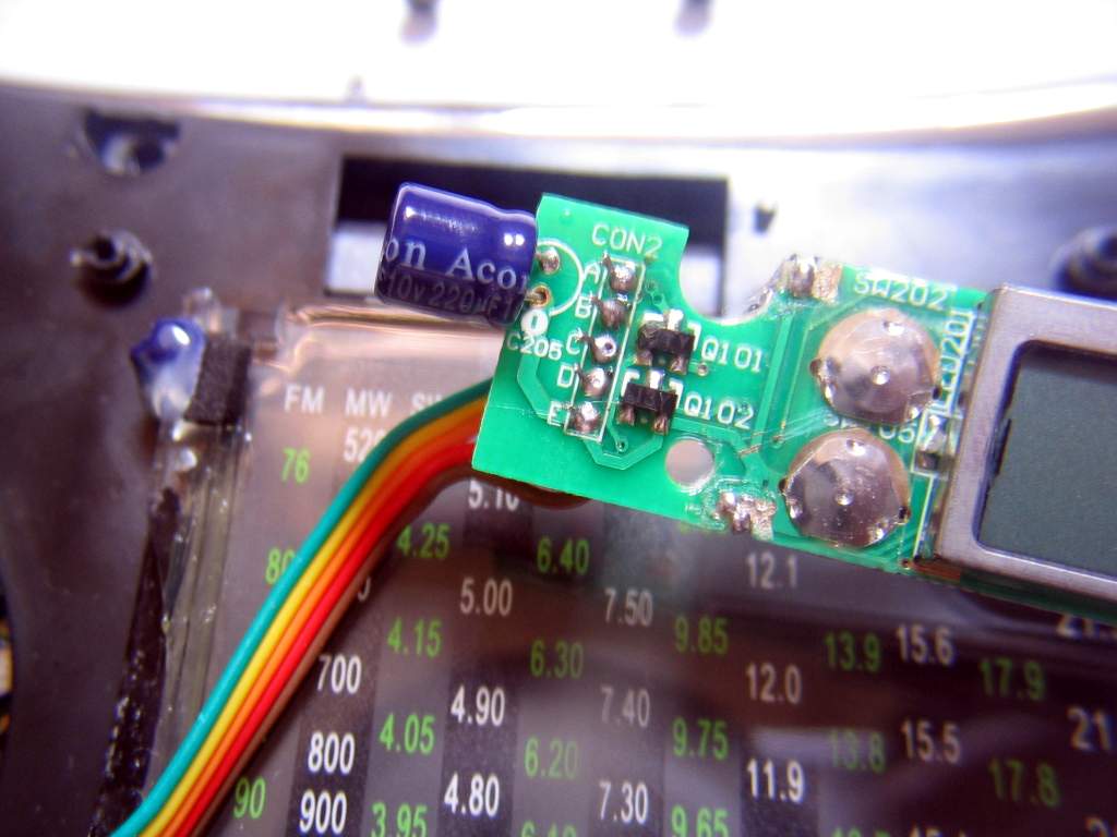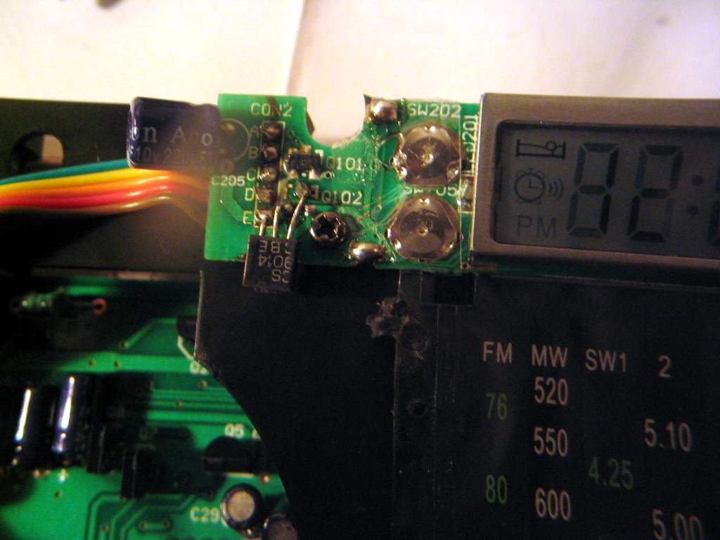 说来好笑,为了更好地查找线路,我焊下了钟控板的五根连线线,结果焊回去的时候,不小心焊短路了而没有注意到,通电以后,Q102被烧毁,不得不找了一枚9014代替了上去,代换后工作正常!