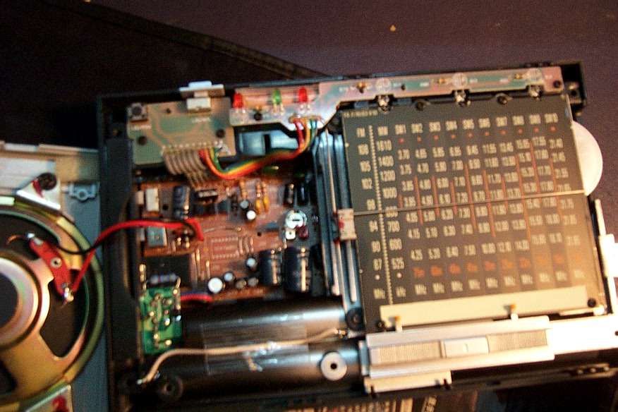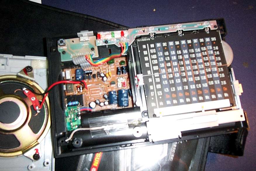 六、机芯取出,为了工作方便焊下3根线:喇叭2根,天线1根。