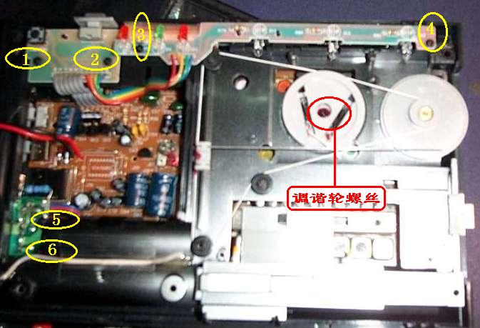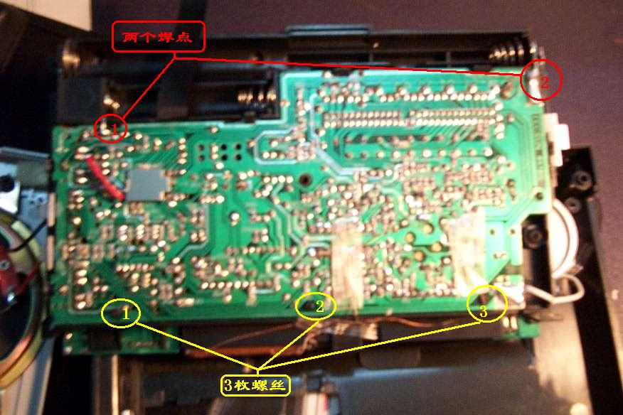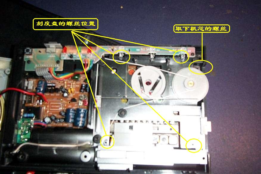 七、卸下电路板时,先用小起子拆下机芯上的3块小线路板,共6枚螺丝,然后拧下调谐轮上的1枚螺丝,调谐拉线系统不用拆。