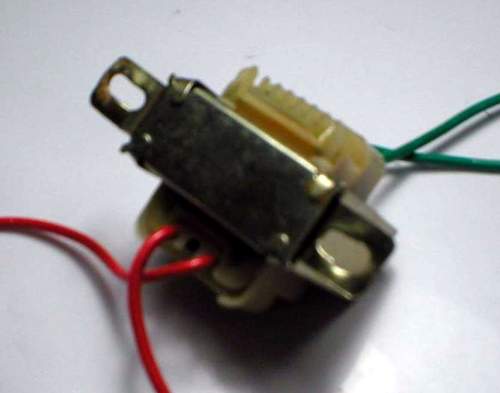 输出牛和二次变压器,都是直接使用现代的市品小电源变压器(见图4),拆去固定的外皮使用。能够采用市品很重要,这样可保证你不会因为怕绕牛牛而半途而废。两个的规格均为220V:6V或者220V:2×6V(仅用一个6V绕组,另一个空着不用),变压器大致尺寸为□×□×□mm,供购买时参考,矽钢片截面为□×□mm。