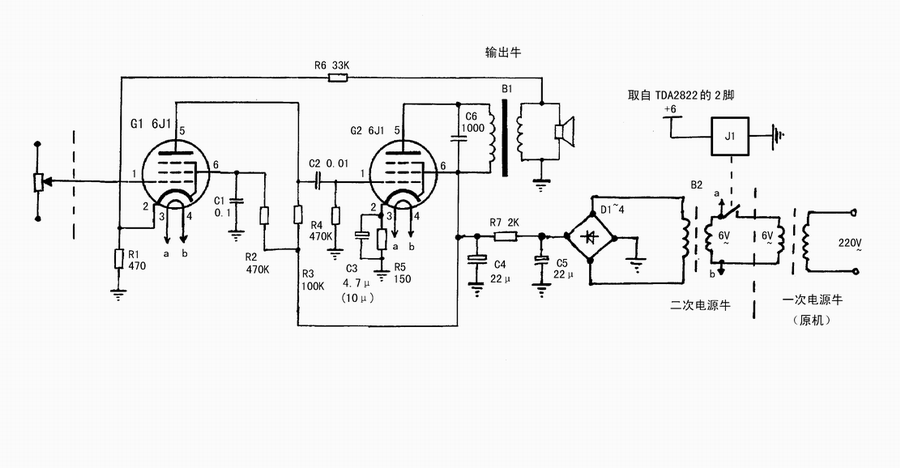 本线路主体与发表过的彩电胆放相同,并调整了G1的负载电阻为100K,相应的帘栅极退耦电阻改为470K。这样可以提高增益。