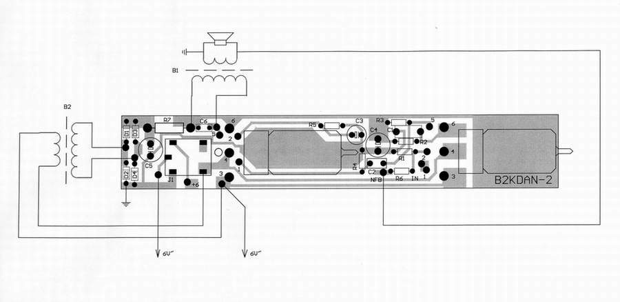 C3容量取的较小,有降交流声的作用。如果用100μ会有少量交流声,晚上好象有点明显。改为10μ就小多了,用4.7μ就几成鬼寂了。这个容量并不影响放音的频响,可计算一下C3与R5的时间常数:C3为10μ时,转折频率是100Hz;C3为4.7μ时,转折频率是200Hz。本机4吋喇叭的频响约为200Hz,(这还是大障板或大音箱下的频率,小机箱中会大大高于此值),所以不会有大的影响。