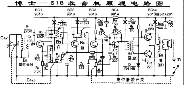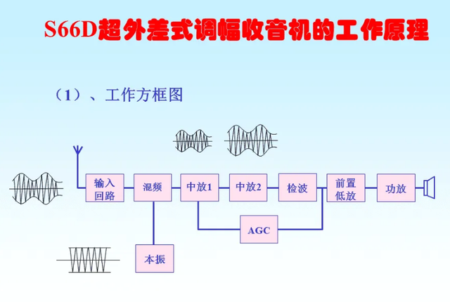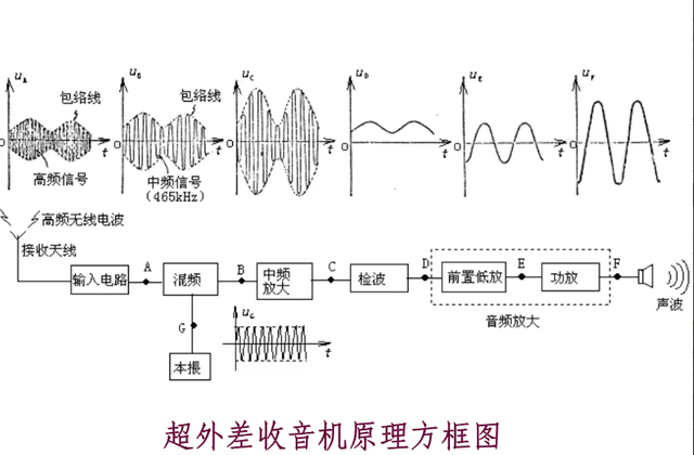 天线接收到的高频信号通过输入电路与收音机的本机振荡频率(其频率较外来高频信号高一个固定中频,中国中频标准规定为465KHZ)一起送入变频管内混合变频,在变频级的负载回路(选频)产生一个新频率即通过差频产生的中频,中频只改变了载波的频率,原来的音频包络线并没有改变,中频信号可以更好地得到放大,中频信号经检波并滤除高频信号。再经低放,功率放大后,推动扬声器发出声音。