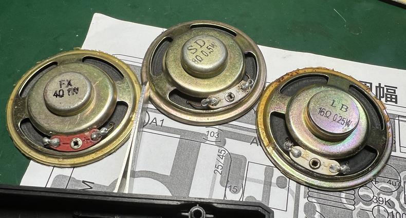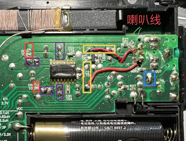 提前准备了三只5cm的小纸盆喇叭准备代换,于是就开始拆机,没有任何压力的打开后看到喇叭果然是纸盆的,功放是意料之中的1622,电容倒是没有发现漏液鼓包。从电路走线上看,它用的德生PL600的接法,省略了双声道输出电容,用一只220uf电容在地端隔直。这是一种廉价的节约成本的做法,对OTL耳机立体声声音是不利的,对喇叭BTL驱动倒不影响。所以打磨的思路就是恢复左右声道输出电容,喇叭绕过电容 接到输出电容前端。功放级的输入电容,负反馈电容很关键,尽量用优质电容,负反馈电容可以用钽,我用了松下的老红豆钽电容。380的左右声道输入端对地的贴片电容要去掉,这个电容就是衰减高音的罪魁祸首。如图那样改动后试听,喇叭声音明显有了高音成分,音量略微增大了一点,我试用了提前准备的三只喇叭,跟德生原装的没有明显改善,所以就没换。耳机立体声效果更佳通透,没之前那么糊和闷了。