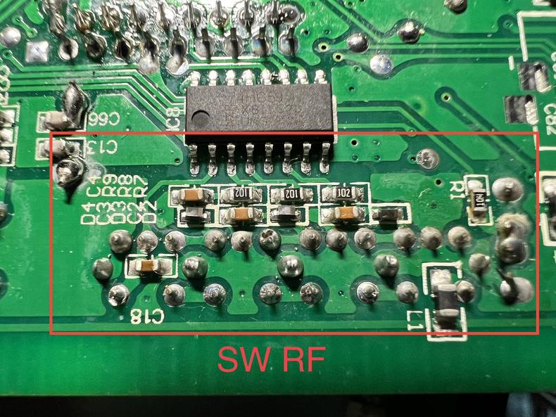 这台1780L短波灵敏度很低。我之前的文章分析过,1780短波其实很优秀,很大原因是因为短波天线输入带有LC选频槽路和场管高放电路,各个LC输入槽路对应不同频段,通过电子开关切换。拆机后首先仔细分析了该机的主要电路模块,将原理框图绘制出来,短波部分是关注重点,所以将输入槽路和高放管电路全部绘制出来如下图。可以看到四个输入槽路是通过74HC595串行输入并行输出的电子开关切换。我实际测量了一下,它的槽路频率分界点为7.1Mhz, 11.5Mhz,还有一个记不清了。