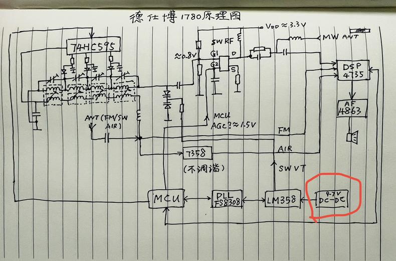 故障发生在整个短波段,所以跟槽路切换或者失谐关系应该不大。再往后看到的是两个背靠背的变容二极管,然后就是一只双栅极场效应管了,从这两个元件看来德仕博还是比较讲究的。大概测了一下这只管子的工作点也基本正常。中波天线接入位于短波高放管之后,中波正常 说明短波高放之前一定有问题。我用镊子触碰DSP芯片的第四脚也就是调幅输入,短波效果很好,信噪比很高,这说明短波高放多半没有发挥作用,反而还在衰减信号。高放管工作点正常,那它之前的电路多半有问题,缩小了故障范围就好办了,先测各个中周,未发现断路,测关键的耦合电容也是好的,那就要怀疑变容管了。这个变容管是两只背靠背的排列,通过一个104的电阻提供VT。测了一下VT,发现VT几乎没有,更不会随着调谐而变化。继续顺藤摸瓜,发现VT来自LM358运放的第一脚,它的第二脚受锁相环FS8308控制,第八脚为Vcc,根据原理,这个Vcc就应该是来自DCDC模块的高压,测该电压只有1.2v显然也是不对的。我外接注入一个10V的直流到第一脚,短波灵敏度马上正常,确定无疑是DCDC模块问题,大概率停振了导致无输出。然后检查贴片三极管和阻容元件都未发现异常。这种问题只有尝试了,把所有元件加焊一遍,将两只NPN三极管更换后,高压输出大概在9.8v左右很正常,之前只有1.2v,至此故障暂时排除但是还有反复,需要增大振荡负反馈,也就是增大100p电容到180p,使电路更容易起振。修复后的对比效果,请移步我的视频发布。