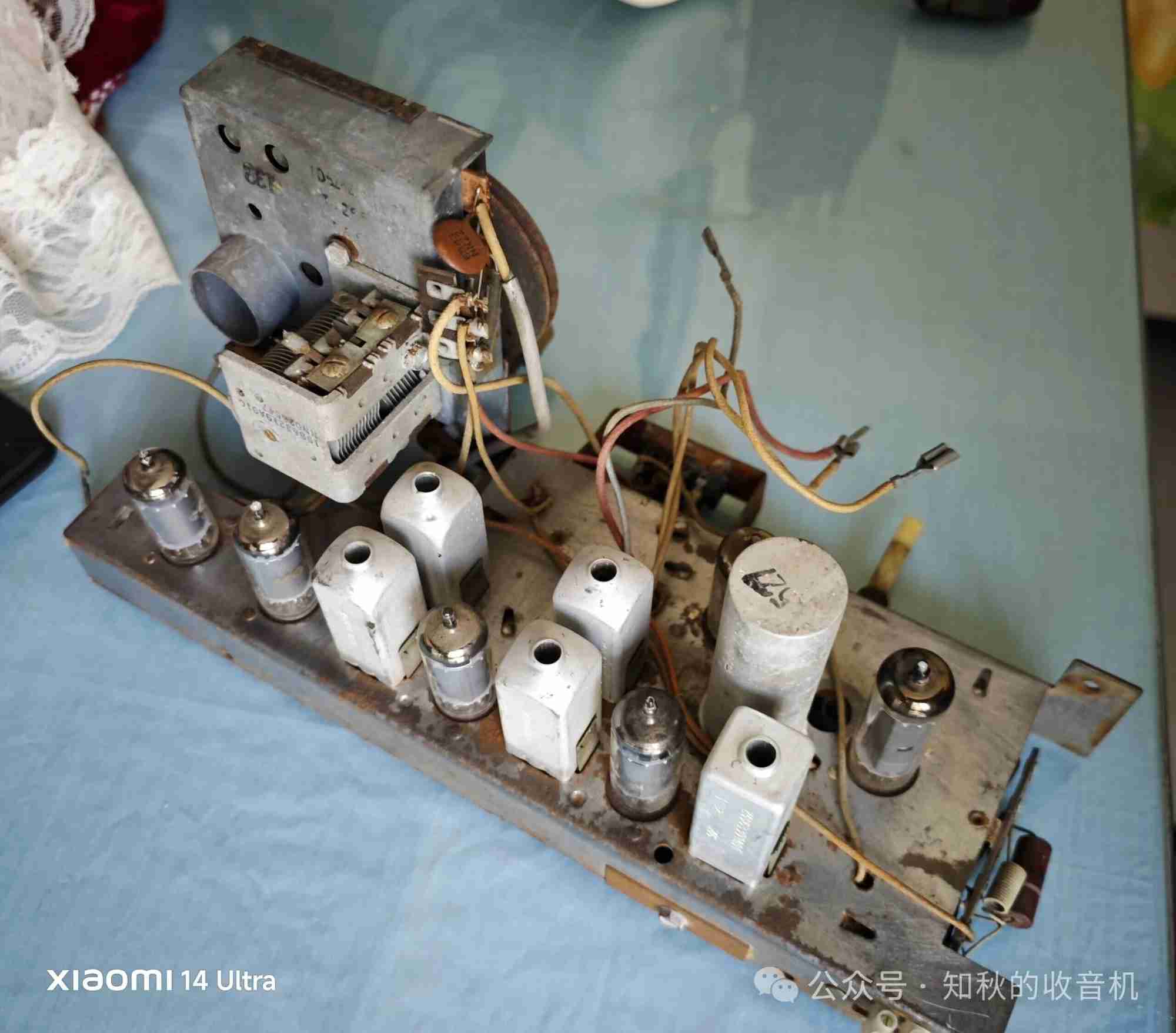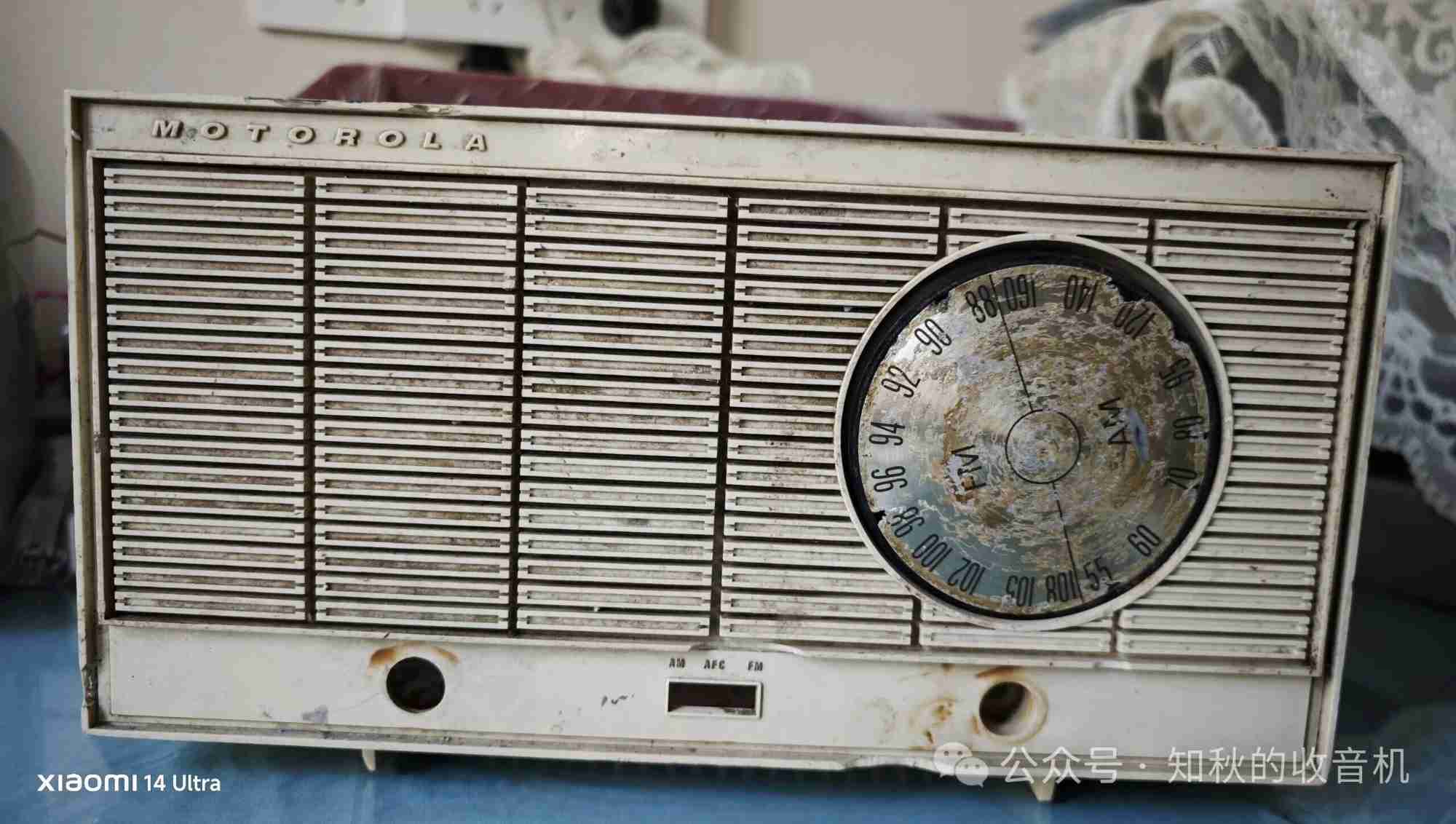 网上淘了一台机壳正面有摩托罗拉的英文字母,不知道是摩托罗拉的什么型号的收音机,此机也是串丝机,使用110伏电压,共用七只电子管,调频部分是两级中放,一极鉴频。调幅部分是正常的两级中放。所用电子管型号:12DT8 12BE6 12BA6 12BA6 12AU6,12AV6 50c5,管子都是摩托罗拉原装管。从管子型号和中放级数看,这是台高档收音机。