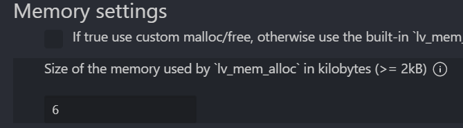 设置为6,默认的大小为32,就是32K,这样就会产生一个大小为32K的全局变量,这个才是内存占用的罪魁祸首。一开始没发现这一点,导致加入LVGL程序后,内存根本不够用。这里设置为6可以不报错,试过5或者更小,但在运行过程中会出错。