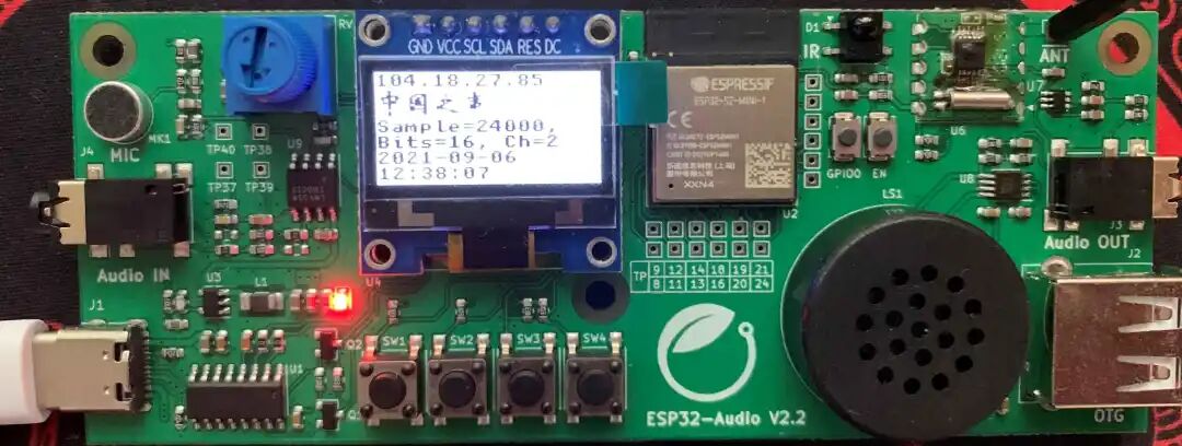 I (439) cpu_start: Starting scheduler on PRO CPU.I (441) gpio: GPIO[41]| InputEn: 0| OutputEn: 1| OpenDrain: 0| Pullup: 0| Pulldown: 0| Intr:0I (441) gpio: GPIO[42]| InputEn: 0| OutputEn: 1| OpenDrain: 0| Pullup: 0| Pulldown: 0| Intr:0I (461) spi_bus: SPI2 bus createdI(461) spi_bus: SPI2 bus device added, CS=38 Mode=0 Speed=20000000I (661) lvgl_gui: GUI Run at esp32s2 Pinned to Core0I (661) lvgl adapter: Alloc memory total size: 1024 ByteI (661) lvgl_gui: Start to run LVGLI (761) PLAY_LIVING_STREAM:I (771) wifi:wifi driver task: 3ffd68bc, prio:23, stack:6656, core=0I (771) system_api: Base MAC address is notsetI (771) system_api: read default base MAC address from EFUSEI (781) wifi:wifi firmware version: c7d0450I (781) wifi:wifi certification version: v7.0I (781) wifi:config NVS flash: enabledI (781) wifi:config nano formating: disabled··················································W (1591) PERIPH_WIFI: WiFi Event cb, Unhandle event_base:WIFI_EVENT, event_id:4I (1591) wifi:AP's beacon interval = 102400 us, DTIM period = 1I (2461) esp_netif_handlers: sta ip: 192.168.123.100, mask: 255.255.255.0, gw: 192.168.123.1I (2461) PERIPH_WIFI: Got ip:192.168.123.100I (2461) GET_TIME: Initializing SNTPI (2471) GET_TIME: Waiting for system time to be set... (1/10)I (2471) PLAY_LIVING_STREAM: [1.0] Create audio pipeline for playbackI (2481) PLAY_LIVING_STREAM: [1.1] Create http stream to read dataI (2491) PLAY_LIVING_STREAM: [2.2] Create PWM stream to write data to codec chipI (2501) PLAY_LIVING_STREAM: [2.3] Create aac decoder to decode aac fileI (2501) PLAY_LIVING_STREAM: [2.4] Register all elements to audio pipelineI (2511) PLAY_LIVING_STREAM: [2.5] Link it together http_stream-->aac_decoder-->pwm_stream-->[codec_chip]I (2521) AUDIO_PIPELINE: link el->rb, el:0x3ffdceac, tag:http, rb:0x3ffdfa98I (2531) AUDIO_PIPELINE: link el->rb, el:0x3ffdf718, tag:aac, rb:0x3ffdfad4I (2541) PLAY_LIVING_STREAM:I (2551) PLAY_LIVING_STREAM: [ 3 ] Set up event listenerI (2551) PLAY_LIVING_STREAM: [3.1] Listening event from all elements of pipelineI (2561) PLAY_LIVING_STREAM: [3.2] Listening event from peripheralsI (2571) PLAY_LIVING_STREAM: [ 4 ] Start audio_pipelineI (2581) AUDIO_ELEMENT: [http-0x3ffdceac] Element task createdI (2581) AUDIO_ELEMENT: [aac-0x3ffdf718] Element task createdI (2591) AUDIO_ELEMENT: [output-0x3ffdf338] Element task createdI (2601) AUDIO_PIPELINE: Func:audio_pipeline_run, Line:359, MEM Total:87268 BytesI (2601) AUDIO_ELEMENT: [http] AEL_MSG_CMD_RESUME,state:1I (2611) AUDIO_ELEMENT: [aac] AEL_MSG_CMD_RESUME,state:1I (2621) AUDIO_ELEMENT: [output] AEL_MSG_CMD_RESUME,state:1I (2621) AUDIO_PIPELINE: Pipeline startedI (2631) gpio: GPIO[1]| InputEn: 1| OutputEn: 0| OpenDrain: 0| Pullup: 1| Pulldown: 0| Intr:0I (2641) board_button: Button[0] createdI (2641) gpio: GPIO[2]| InputEn: 1| OutputEn: 0| OpenDrain: 0| Pullup: 1| Pulldown: 0| Intr:0I (2651) board_button: Button[1] createdI (2651) gpio: GPIO[3]| InputEn: 1| OutputEn: 0| OpenDrain: 0| Pullup: 1| Pulldown: 0| Intr:0I (2661) board_button: Button[2] createdI (2671) gpio: GPIO[6]| InputEn: 1| OutputEn: 0| OpenDrain: 0| Pullup: 1| Pulldown: 0| Intr:0I (2681) board_button: Button[3] createdI (2691) rda5807m: Device initializedI (2691) rda5807m: Frequency: 102200 kHzI (2701) HTTP_STREAM: total_bytes=789I (2711) HTTP_STREAM: Live stream URI. Need to be fetched again!I (2741) rda5807m: rda5807m_wait_and_finish_tuneI (2781) HTTP_STREAM: total_bytes=57780I (2781) CODEC_ELEMENT_HELPER: The element is 0x3ffdf718. The reserve data 2 is 0x0.I (2781) AAC_DECODER: a new song playingI (2791) AAC_DECODER: this audio is RAW AACI (2821) PLAY_LIVING_STREAM: [ * ] Receive music info from aac decoder, sample_rates=24000, bits=16, ch=2I (4251) GET_TIME: Notification of a time synchronization eventI (5471) main: The current date/time in Shanghai is: 2021-09-04 19:27:38I (6471) main: The current date/time in Shanghai is: 2021-09-04 19:27:39W (6801) HTTP_STREAM: No more data,errno:0, total_bytes:57780, rlen = 0I (6801) AUDIO_ELEMENT: IN-[http] AEL_IO_DONE,0I (6831) HTTP_STREAM: total_bytes=57848板子运行现象