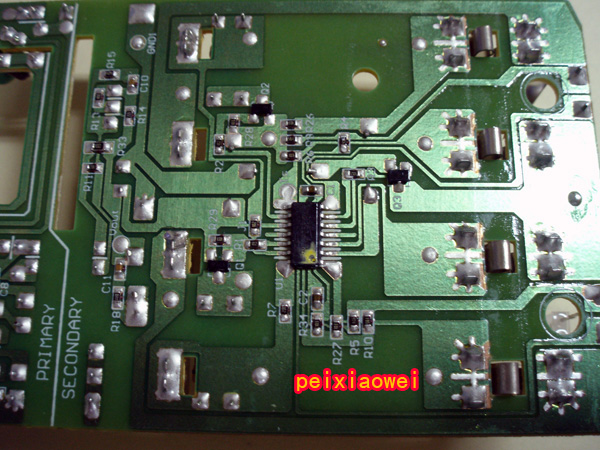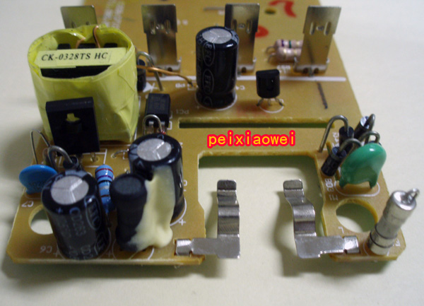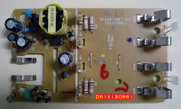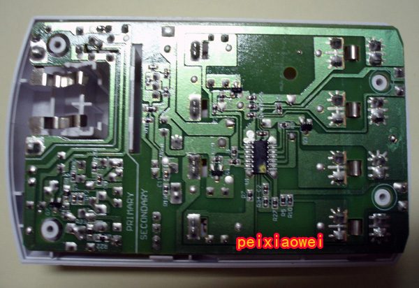 八、线路板正面:使用的是开关电路(电源变压),对市电适应性较强,100-240V,50/60Hz的市电都可正常使用,长时间充电也不会过热,不错!