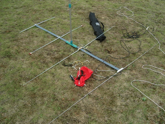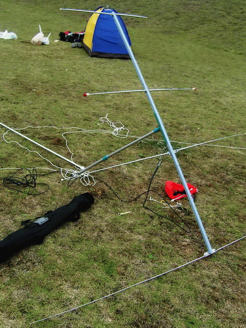 4.以基座为中心在地面标出三个固定风缆下锚钉的位置。把其中两根风缆“半固定”好位置,天线倒向他们一侧。