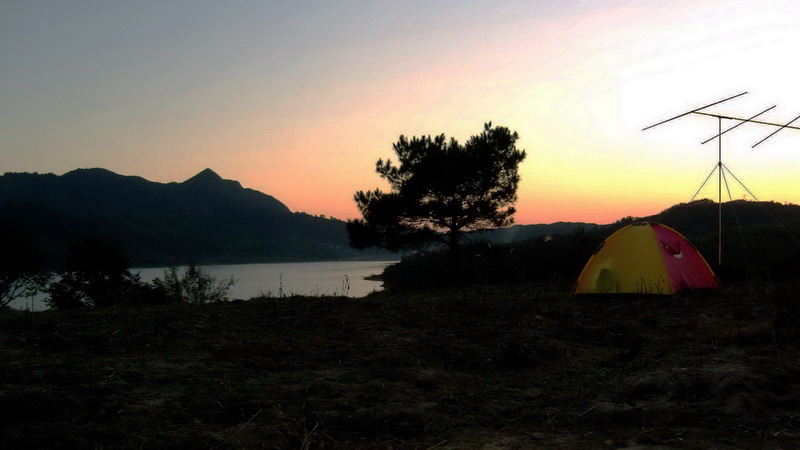 W.皖南某地,暮色寒风中的帐篷与挺立的天线。