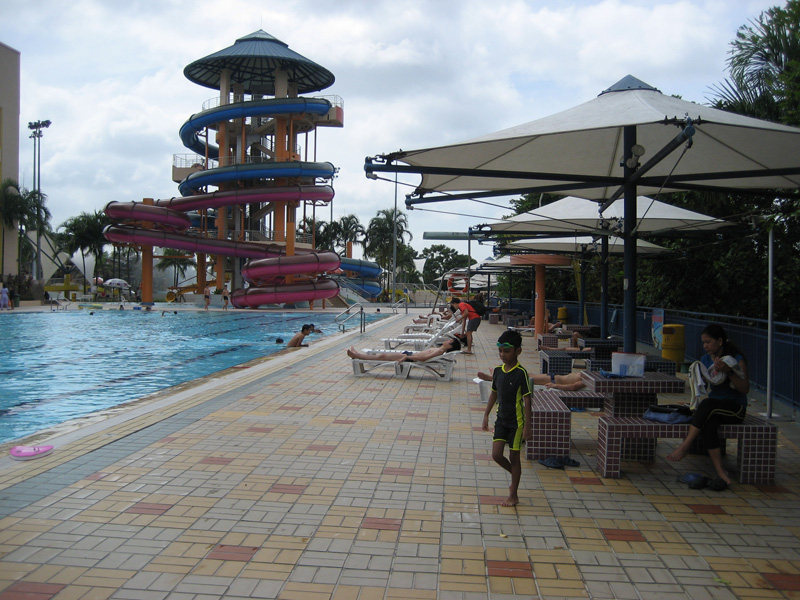 像下图这样有大池、小池、按摩池、高层滑梯、人造海浪的游泳池,老人门票为新元8角,合人民币4元正。