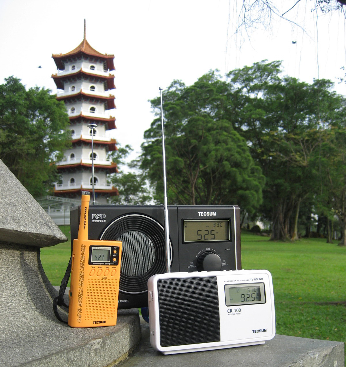随着收音机的不断进步,每次在新加坡听广播的内涵也不断深入,本次带了三台收音机:R-919数显全波段立体声收音机,CR-100数字调谐立体声调频/中波/电视伴音收音机,CR-1100DSP调频/中波收音机。R-919是因为灵敏度好,用于听短波,CR-100用于对比CR-1100,CR-1100是新机,取其DSP功能,特别是具有场强和信噪比的分贝(dB)指示。