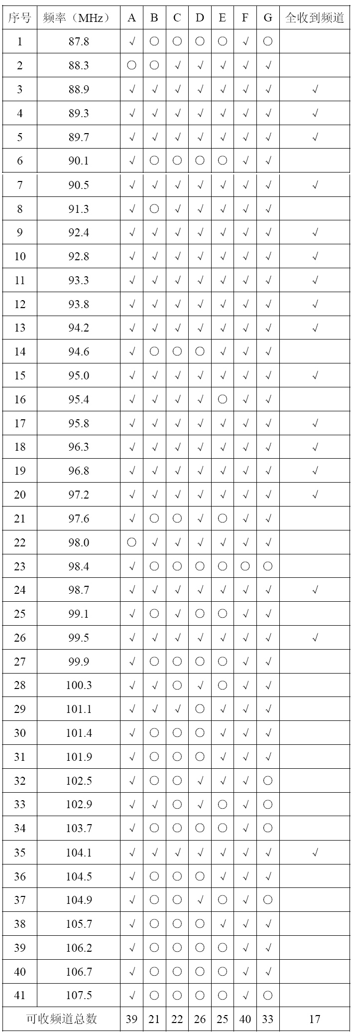 被认可各点均可收到的频道共17个:88.9、89.3、89.7、90.5、92.4、92.8、93.3、93.8、94.2、95.0、95.8、96.3、96.8、97.2、98.7、99.5、104.1。带“*”的电台全是新传媒属下电台,共12个,只有94.6华语台覆盖差一些。而战备协会的88.3和98.0、报业和职总的91.3,100.3,他们的广播覆盖情况都不佳,不能算是无缝覆盖全新加坡岛!