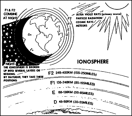<P 20px?>这些无线电信号传播路径只是世界上的主要地区。以国际标准时(UTC)每个小时为单位描述。为保证在二个地点之间有一条好的通信链路,这些射频频率大约在最高可用频率(MUF -Maxiumum Usable Frequencies)的80 到90% 之间,但也许是50% 或90% 。如果遇到一场地磁风暴、太阳耀斑、或其它事件发生,信号实际上通过的道路会发生变化。在电离层风暴或太阳事件期间(如太阳耀斑),优选运行的频率 (Optimal Working Frequency) 将更低甚而闭合。当然有更多因素会介入到OWF中间来,包括吸收强烈的更低的地区(象D 层)、 无线电信号离开发射源天线的"发射角" 等等。比如果一个5 兆赫的信号经过D 区,而且该区对6 兆赫上下的信号没有多大损耗,并且E 、F 层还折射6 兆赫信号, LUF 就是6 兆赫。但MUF 也许是12 兆赫。这时的OWF (最佳运行频率) 将处在6 到12 兆赫之间——大约10 兆赫。在不受干扰的月份里,01:00 到02:00 (当地时间、而非UTC)之间的时候是 HF 段最好的传播时段。