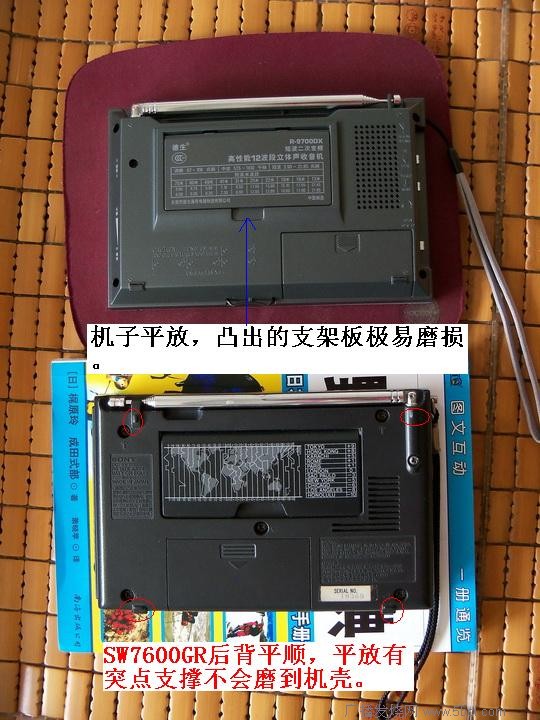 5、德生啊德生,从R9710开始到PL600的机壳基本一个造型,要改改了。后壳四边全是斜面,后果就是底面太窄而增加钢丝支架来解决直立的问题,还有就是使内部空间容积变小了。面与面之间的过渡加些弧形元素吧,参考一下SONY SW40的右侧面的设计,让握持手感更好一些。![[点击]另外窗口打开图片...](/content/uploadfile/201206/20120605131732438.jpg)