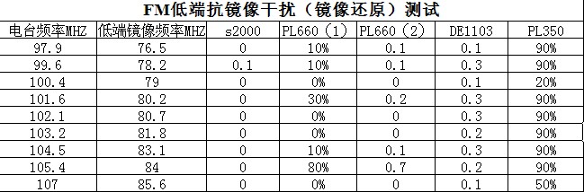 测试小结:从上述测试结果可以看出,五台机子镜像抑制效果为:S2000>PL660>DE1103>PL350。其中S2000的抗镜像最强,除了78.2MHZ出现镜像之外,其余频点均为出现镜像。PL660的镜像抑制效果也不错,但在84MHZ出现了一个很强的镜像。DE1103的镜像抑制能力弱于PL660,基本每个频点都有镜像信号出现。PL350的镜像抑制能力最差,大多数频点的镜像还原都达到90%,因此PL350对于校园广播接收都显得无能为力。此外,两台第三版的PL660镜像抑制没有出现明显个体差异。