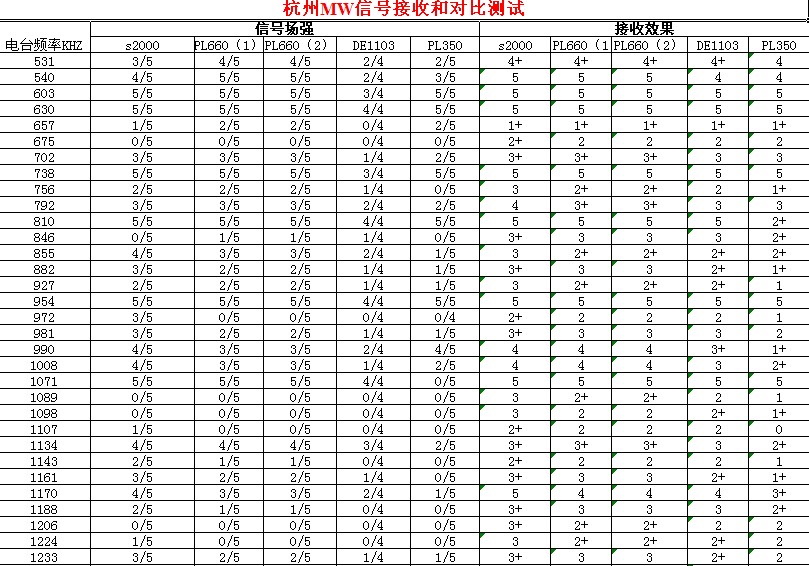 测试小结:FM总体接收性能:S2000>PL660>DE1103>PL350。从上述测试结果可以看出,S2000的FM接收性能可以用强悍来形容,无论是本地还是远程电台,无论是强台弱台,都一网打尽,而且电台听感都能达到3+以上,收听效果十分良好。PL660的FM性能也相当不错,只是远程电台接收时容易受到本地相邻频率强台的干扰,需要将天线缩短一节才能听清,总体接收效果弱于S2000。毕竟受到体积和成本的限制。但由于保留了五连调谐技术,PL660的FM性能十分出色。此外也可以看出,两台第三版的PL660在FM听感上没有明显差异,说明机子个体差异较小。DE1103的FM灵敏度非常高,但抗干扰能力较差。接收远程电台时需要缩短天线,并且反复调整天线方向才能达到接好的收听效果。但由于本次测试中用的是老版的1103(据说新版1103FM的RF部分电路有改动,收听效果更好),新版的机子FM效果如何,期待大家的评测。PL350的FM性能是四台机子中最弱的,无论是灵敏度还是抗干扰能力都较弱,甚至在99.1MHZ的测试中,无论怎么调节天线方向和灵敏度开关,都没有收到信号,仅仅在收听本地电台时效果良好,而不适用于FM-DX。最后需要说明的是,信号场强与收听效果无关,在测试过程中发现,S2000在没有电台信号的情况下S表仍然是满格的,PL660和PL350也有类似的情况。DE1103调频没有信号强度指示。