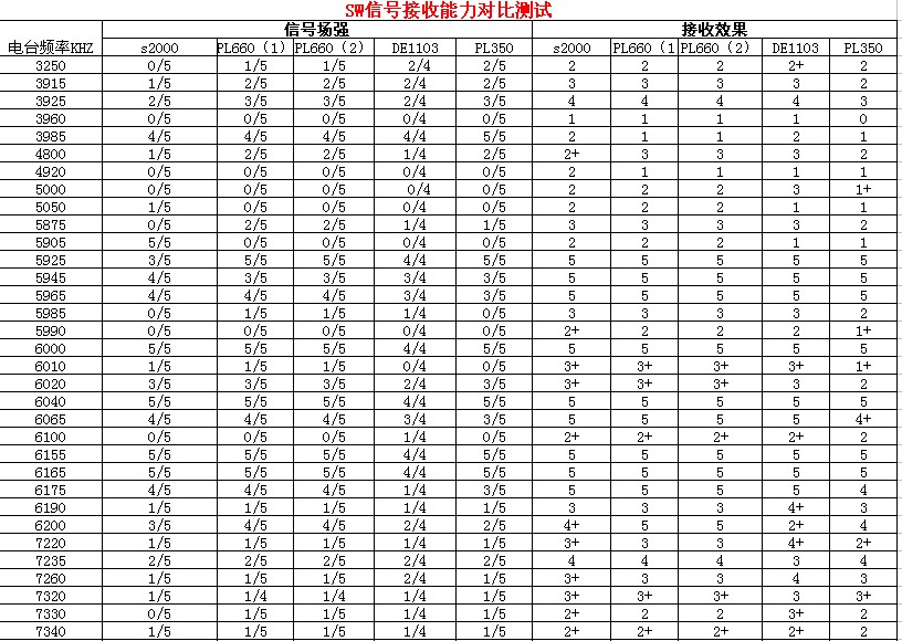 测试条件:天线全长,在测试过程中根据需要调节天线长度和方向。所有机子灵敏度开关均处于DX档位(DE1103除外),S2000的BW选择为narrow