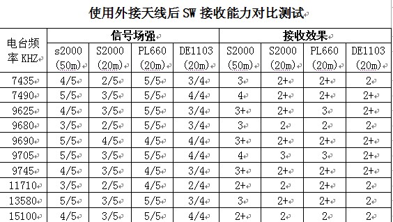 测试说明:为了测试外接天线对接收能力的改善,选择了10个弱信号频点,分别给三台机子接上20m外接天线,选择10个弱信号频点进行测试。此外由于S2000的抗过载能力较强,还专门测试了50m外接天线的收听情况。